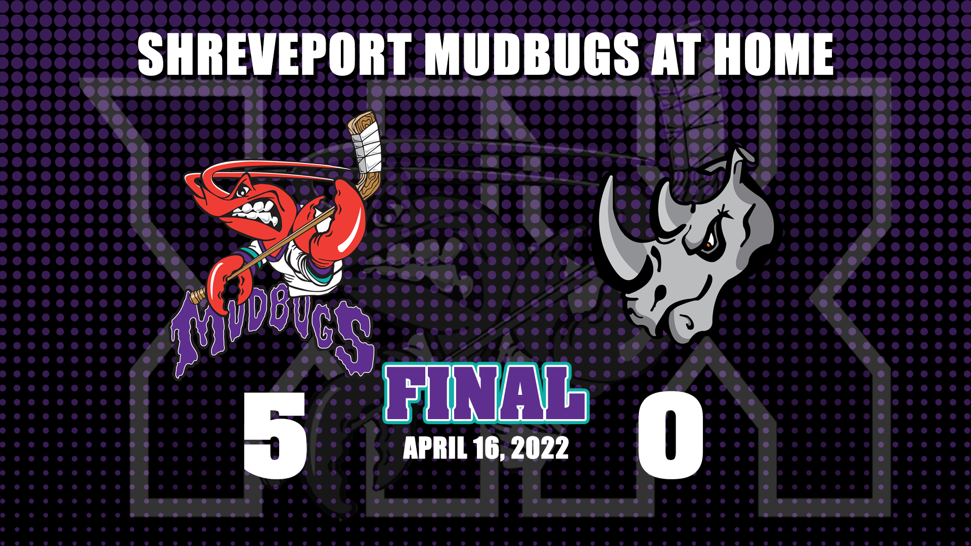 The Shreveport Mudbugs (34-21-5) scored five times in the game and thrashed the El Paso Rhinos, 5-0 in the regular season finale at George’s Pond in Hirsch Coliseum Saturday night.